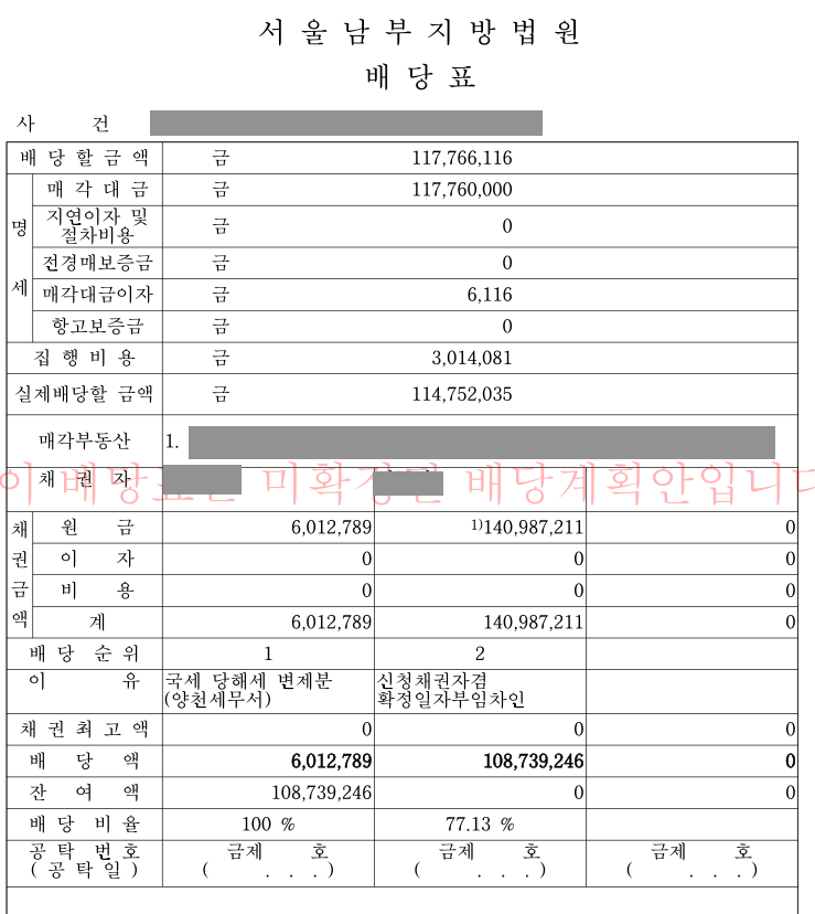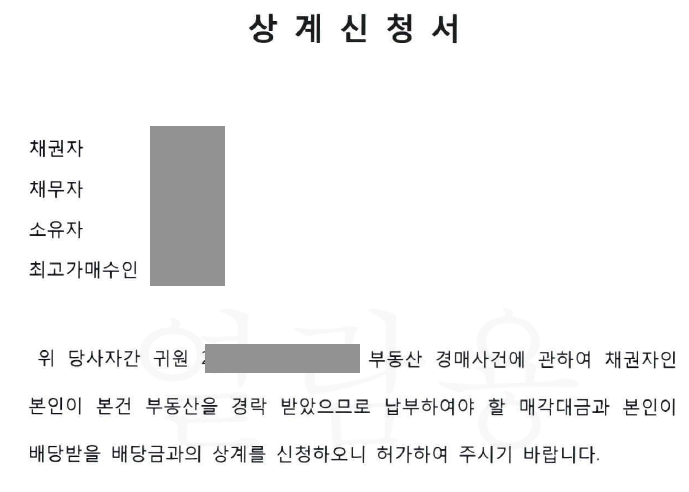 셀프낙찰후 법원에 상계신청서를 제출했습니다. 배당표를 살펴보면: