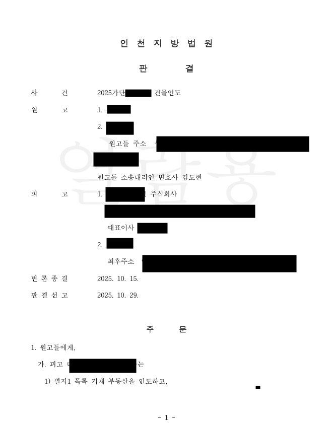 전부 승소! 재판부는 의뢰인들의 청구를 모두 인용하였습니다. 피고 법인에는 건물 인도와 함께 밀린 월세 및 관리비 전액 지급을, 불법 점유자에게는 즉각적인 퇴거를 명하는 판결을 내렸습니다. 꼬여버린 임대차 관계를 명쾌하게 정리하고, 의뢰인의 소중한 부동산을 되찾아 드린 성공적인 사례입니다.