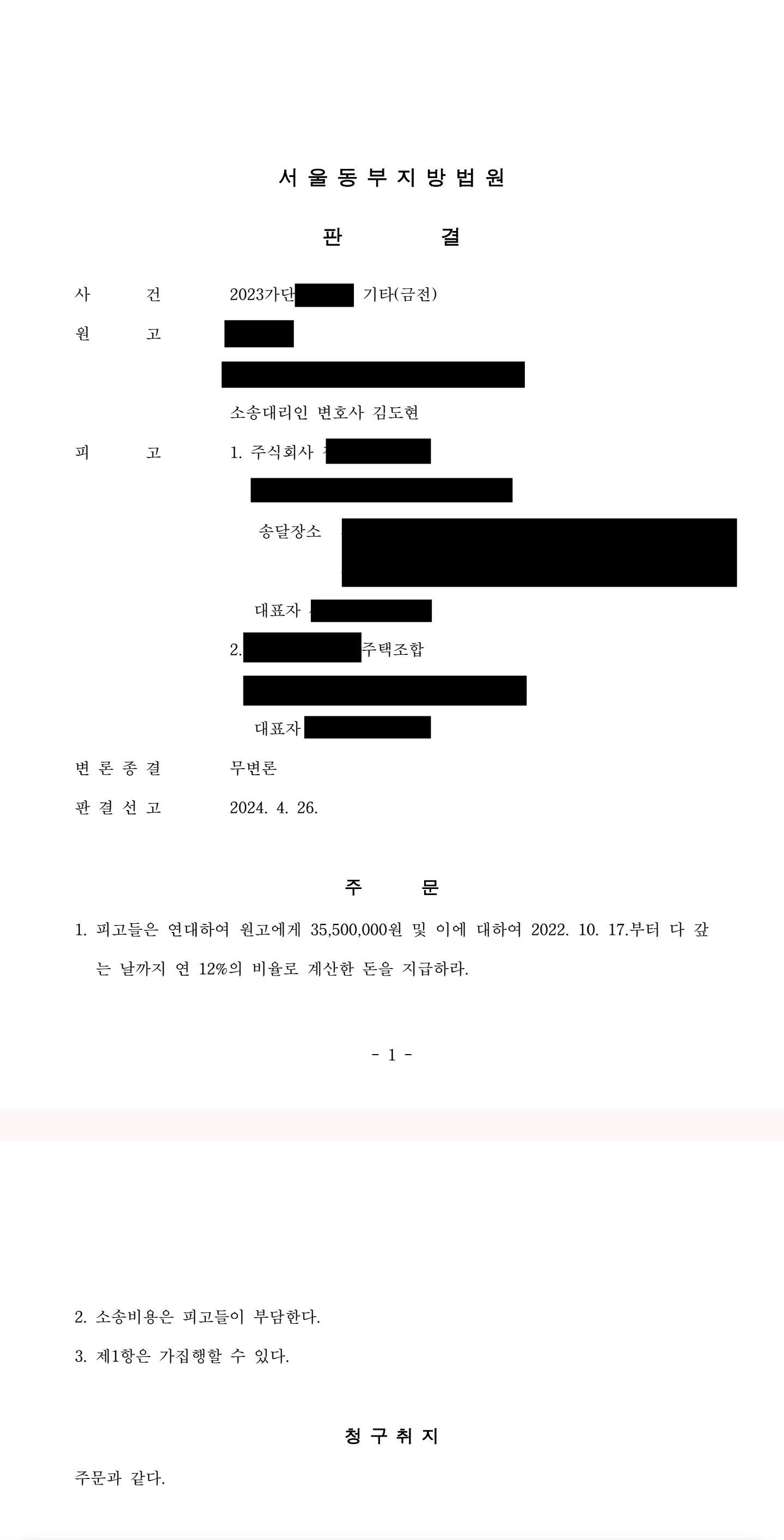 ![[민사] 지역주택조합 탈퇴 환불금, 미지급한 잔금 전액 승소](/_next/image?url=https%3A%2F%2Fd2ai3ajp99ywjy.cloudfront.net%2Fuploads%2Ftitleimage%2Foriginal%2F5c791f5b2e3288cbabeb493a-original.jpg&w=3840&q=75)