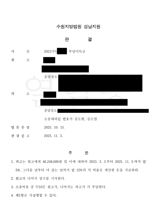 청구 금액 1억 원 이상 방어 성공! (소송비용 70% 원고 부담) 재판부는 무율의 주장을 대부분 받아들였습니다.