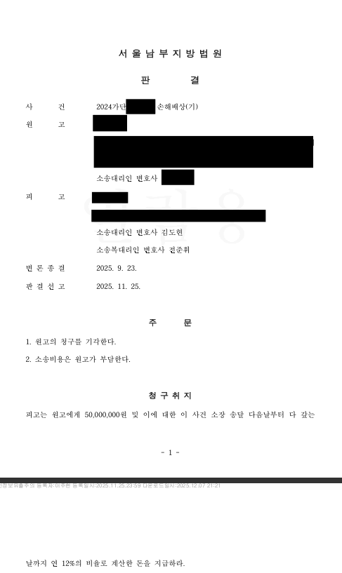청구 기각 원고 전부 승소! 재판부는 무율의 주장을 받아들여 "원고가 제출한 증거들만으로는 피고의 불법행위 책임을 인정하기에 부족하고, 달리 이를 인정할 증거가 없다"고 판시하였습니다. 결국 법원은 원고의 5,000만 원 청구를 모두 기각하고, 소송비용 또한 원고가 전액 부담하라는 판결을 내렸습니다. 자칫 파렴치한 가해자로 몰릴 뻔했던 의뢰인의 억울함을 완벽하게 풀어드린 성공적인 사례입니다.