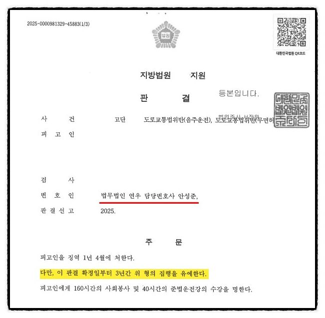 음주운전 재범이나 무면허 운전은 결코 가볍게 넘길 수 없는 중범죄입니다. 하지만 진심 어린 반성과 함께 전문적인 법적 조력을 통해 자신의 상황을 소명한다면 최악의 결과는 충분히 피할 수 있습니다. 이번 사건 역시 변호인의 전략적 대응과 피고인의 성실한 교정 노력이 인정되어 실형을 면하고 집행유예라는 최선의 결과를 이끌어낸 성공사례였습니다.
