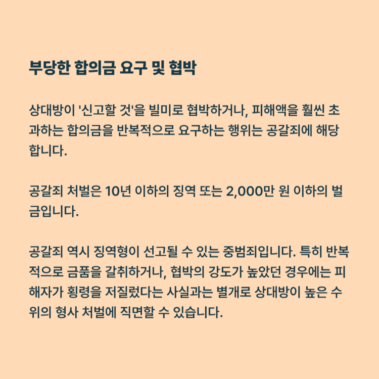 상대방이 '신고할 것'을 빌미로 협박하거나, 피해액을 훨씬 초과하는 합의금을 반복적으로 요구하는 행위는 공갈죄에 해당합니다.