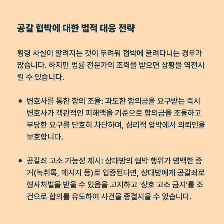 공갈죄 고소 가능성 제시: 상대방의 협박 행위가 명백한 증거(녹취록, 메시지 등)로 입증된다면, 상대방에게 공갈죄로 형사처벌을 받을 수 있음을 고지하고 '상호 고소 금지'를 조건으로 합의를 유도하여 사건을 종결지을 수 있습니다.