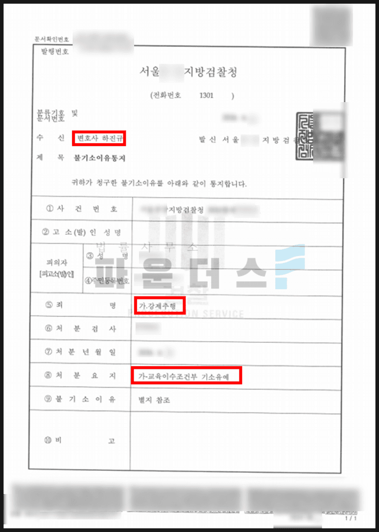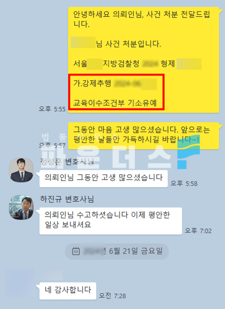 그 결과, 검찰 단계에서 '교육이수조건부 기소유예' 처분을 받고 사건을 조기에 마무리지을 수 있었습니다. 강제추행 혐의가 명백한 상황에서 저희 변호인이 피해자와의 합의를 이끌어내고, 여러 양형 자료를 준비한 끝에 전과가 생기지 않는 선에서 잘 마무리할 수 있었습니다.