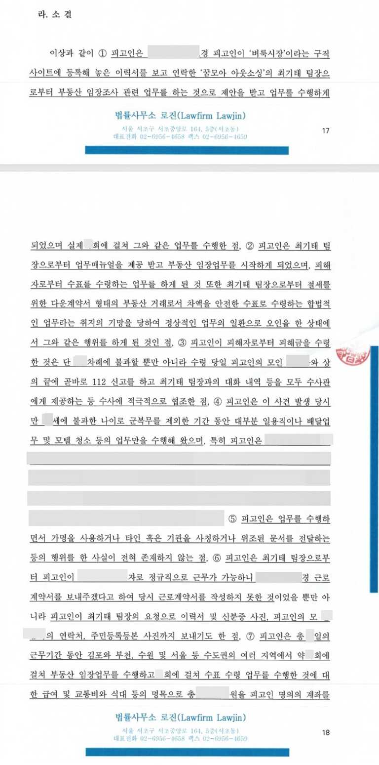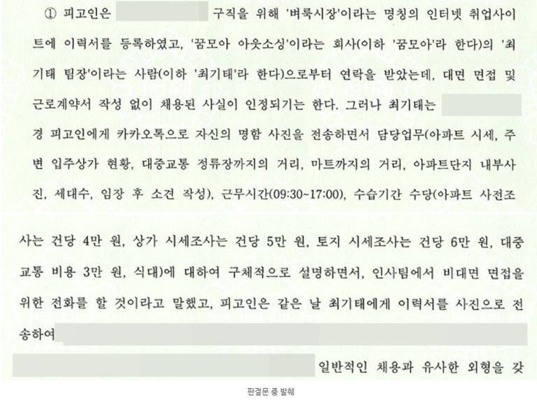 의뢰인은 인터넷 취업사이트에 이력서를 등록하였고, '꿈모아 아웃소싱'이라는 회사의 '최기태 팀장'이라는 사람으로부터 연락을 받게 되었습니다. 의뢰인은 대면 면접 및 근로계약서 작성 없이 채용되어 아파트 시세, 입주 현황 등 임장 업무를 수행하였습니다. 그러던 중 의뢰인은 길거리에서 아파트 계약금을 명목으로 수표를 보이스피싱 피해자로부터 수령하였고, 이로 인해 재판을 받게 되었습니다.