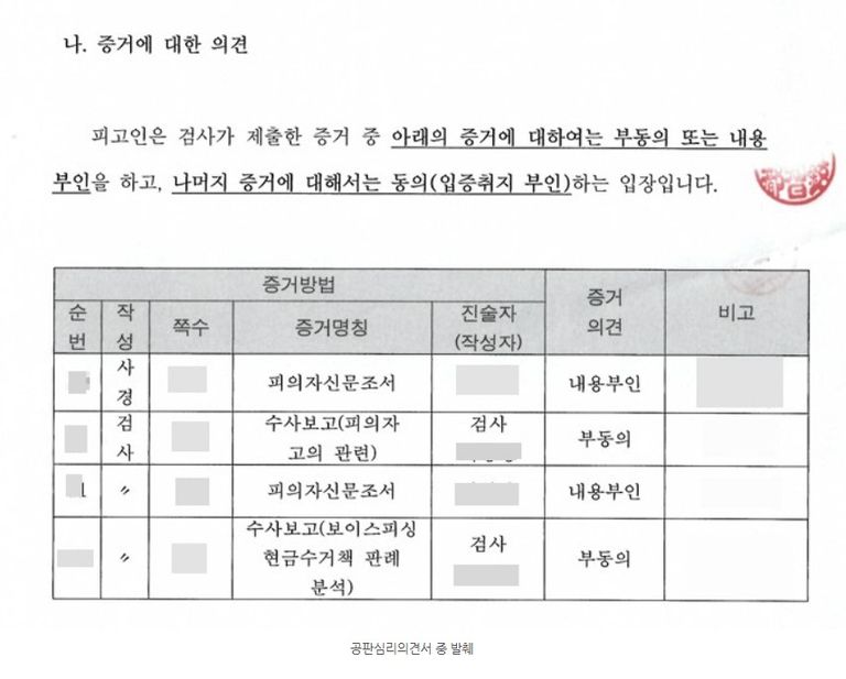 다만, 재판단계에서 혐의를 계속하여 부인하는 경우, 변호인은 의뢰인의 피의자신문조서 내용이 의뢰인에게 불리하다고 판단되면, 증거의견을 밝힐 때, 의뢰인의 피의자신문조서를 '내용부인'하게 됩니다. 증거의견으로 내용부인을 하게 되면, 위 피의자신문조서는 증거로 활용할 수 없게 됩니다. 즉 판사가 위 내용을 확인할 수 없게 됩니다. 다만, 판사는 본인이 직접 피의자신문조서를 확인하는 경우를 선호하기 때문에, 이 점에서 불가피하게 판사의 의심을 불러 일으킬 수 있습니다(뭔가 찔리는게 있으니깐 내용부인을 한다고 생각할 수 있음. 만약 판사가 의뢰인의 피의자신문조서를 확인하고, 그 내용도 의뢰인에게 유리하다면, 무죄의 가능성이 높아짐). 변호인이 의뢰인의 피의자신문조서를 부동의하는 경우, 검사는 의뢰인을 증언대에 세워 피고인신문을 진행하려고 하는 경우가 많은데, 이때 변호인은 의뢰인에게 적절한 질문을 하면서, 피고인신문 과정을 의뢰인에게 유리하게 전개시킬 필요가 있습니다.