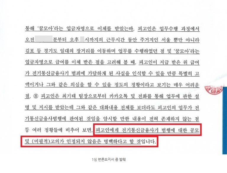 의뢰인은 보이스피싱 조직원과 대화를 나눈 문자메시지를 소지하고 있었고, 증거로 제출이 된 상태였습니다. 물론 검사가 제출한 증거기록에는 의뢰인에게 불리한 부분도 있었지만, 법률사무소 로진은 변론요지서를 통해 의뢰인의 평소 성향과 특징, 의뢰인의 사회 경험 정도, 피고인이 보이스피싱 조직원과 나눈 대화에서 파악이 가능한 조직원의 기망 정도와 의뢰인의 신뢰 형성의 경위, 의뢰인의 얻은 수익의 정도와 출처, 사건 직후 보인 의뢰인의 반응과 조치 등을 세부적으로 정리하여 의뢰인에게 전기통신금융사기에 대한 미필적 고의가 없음을 재판부에 설득하였습니다.