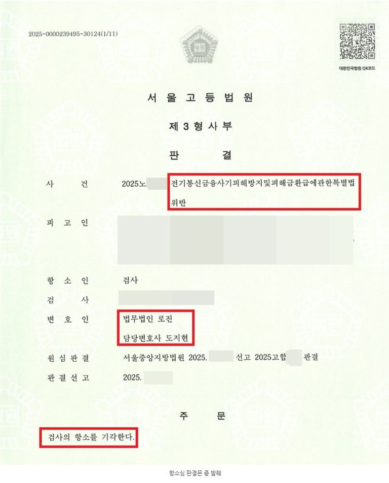보이스피싱 현금 수거책 사건의 의뢰인은 대부분 사회적 경험이 부족하거나, 경제적으로 심한 압박을 받고 있는 사람들입니다. 이번 사건 의뢰인도 사회적 경험이 부족했고, 수사과정에서 어떠한 도움도 받지 못하여 본인에게 불리한 진술을 하기도 하였습니다. 하지만 법률사무소 로진은 의뢰인이 소지하고 있던 증거를 종합하여 의뢰인이 당시 속을 수 밖에 없었던 이유를 적극적으로 재판부에 어필하였습니다. 그 결과 1심 서울중앙지방법원 합의부는 의뢰인에게 전기통신금융사기에 대한 미필적 고의가 없음을 인정하여 무죄를 선고해주었습니다. 이후 검사는 1심 판단에 불복하여 항소를 하였지만, 법률사무소 로진은 마찬가지로 의뢰인을 적극적으로 방어하였고, 항소심 서울고등법원 합의부도 의뢰인을 무죄로 판단하여 검사의 항소를 기각하였습니다. 의뢰인은 다행스럽게도 일상의 평온으로 돌아갈 수 있었습니다.