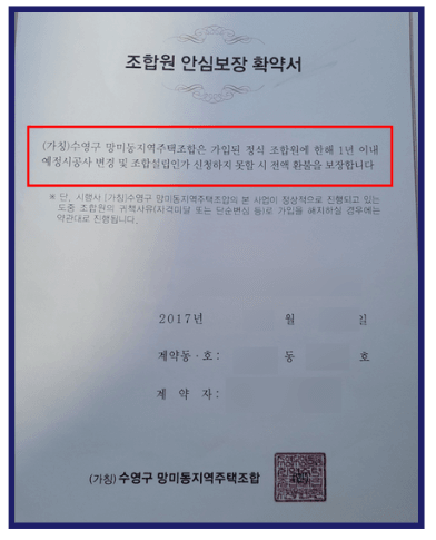 검토 과정에서 확인된 사실 중 하나는, 박00님이 계약 체결 당시 ‘조합원 안심보장 확약서’를 교부받으셨다는 점이었습니다. 이 문서에는 “1년 이내 예정 시공사 변경 및 설립인가 신청을 하지 못할 경우 전액 환불을 보장한다”는 내용의 전액환불 약정이 포함되어 있었는데, 이는 전국 여러 지역주택조합에서 공통적으로 사용해 온 서식입니다. 그러나 이 확약서는 이미 여러 법원에서 법적 효력이 인정되지 않는 문서로 판단된 사례가 누적되어 있어, 해당 약정만으로는 조합원에게 환불 청구권이 발생한다고 보기 어렵다는 점이 확인되었습니다.