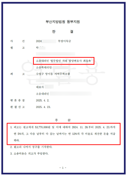 수영구망미동 지역주택조합을 상대로 전액 승소 판결 및 가압류 인용 결정 확보