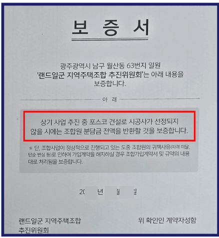 랜드일군 지역주택조합은 계약자 모집 과정에서 일부 계약자들에게 “상기 사업 추진 중 포스코건설로 시공사가 선정되지 않을 시에는 조합원 분담금 전액을 반환할 것을 보증합니다.”라는 문구가 기재된 ‘보증서’ 형태의 문서를 교부하며 조건부 전액환불 약정을 강조해 계약을 유도했습니다. 계약자들은 이를 신뢰하여 사업에 문제가 생기더라도 납입금을 안전하게 돌려받을 수 있을 것이라 기대하고 계약에 응한 것이지만, 이러한 안심보장증서는 대부분 적법한 총회 결의 절차 없이 임의로 발급된 문서에 불과합니다. 실제로 여러 법원 판례에서도 이와 같은 문서를 법적 효력이 없는 무효 문서로 판단해 왔기 때문에, 계약자는 약정을 믿고 계약했음에도 조합이 실질적인 환불 의무를 지지 않는 문제가 발생하게 됩니다. 이는 이후 계약취소 소송에서 중요한 쟁점으로 작용할 수 있는 요소이기도 합니다.