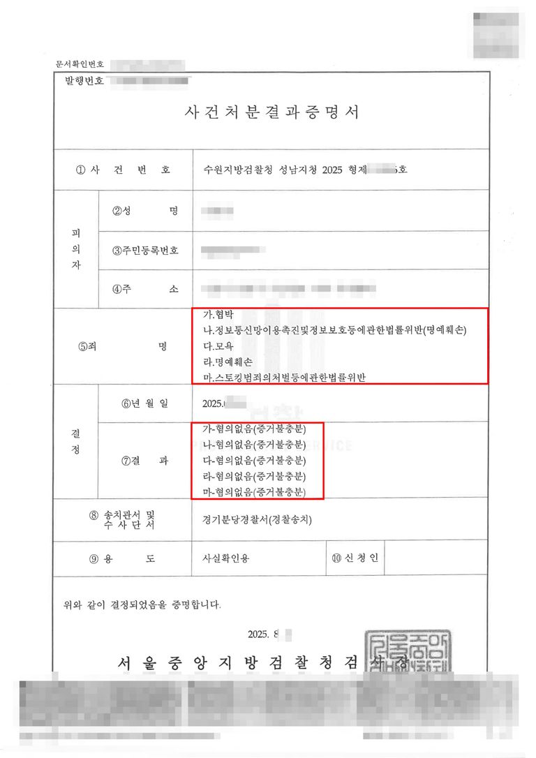경찰은 법무법인 법승의 주장을 대부분 받아들여, 의뢰인이 받은 5가지 혐의에 대해 모두 증거불충분을 이유로 ‘혐의없음’ 불송치 결정을 내렸습니다.