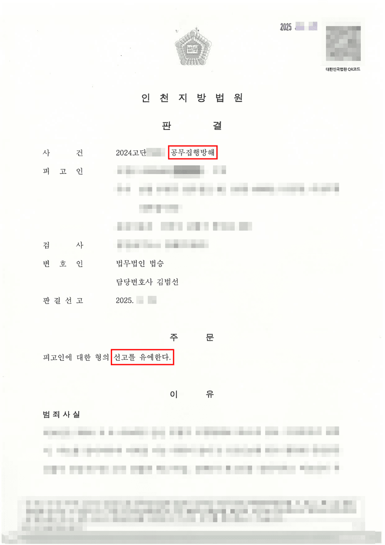의뢰인은 인천지방법원으로부터 선고유예 판결을 얻을 수 있었습니다.