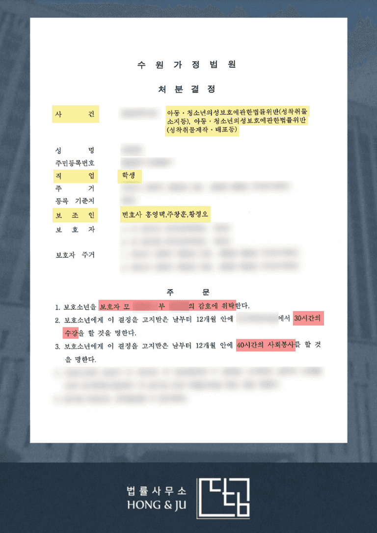 이로써 미성년 의뢰인의 성착취물 제작·배포·소지 등의 아청법 위반 사건은 안산성범죄변호사 조력으로 '소년보호처분 1·2·3호'로 종결됐습니다.