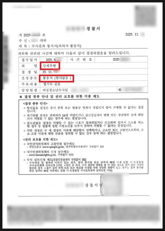 그 결과, 사건은 경찰 단계에서 '불송치' 처분을 받고 조기에 종결하였습니다. 다행스럽게도 의뢰인의 억울한 사정이 수사기관에 잘 전달되어 받아들여졌고, 그 덕분에 의뢰인이 평온한 일상으로 다시 돌아가실 수 있게 되었습니다.