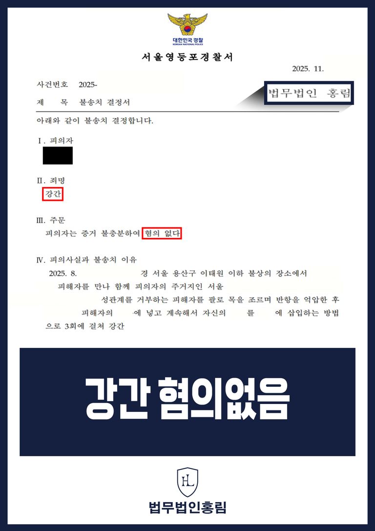 특히 합의 하에 이루어진 성관계였음에도 불구하고, A씨는 성범죄 재판에서 매우 불리한 입장에 처하게 되었으며, 억울함을 해소하고 강간 혐의에 대한 '혐의없음(불송치)' 처분을 목표로 본 법무법인 홍을 방문하였습니다.
