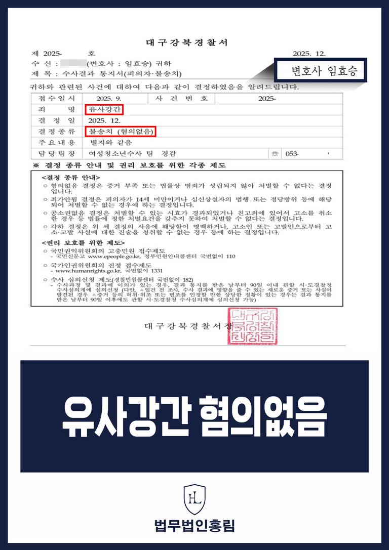 법무법인 홍림 변호인의 치밀한 법리 구성과 객관적인 증거 수집 전략은 수사기관의 판단에 매우 긍정적인 영향을 미쳤습니다.