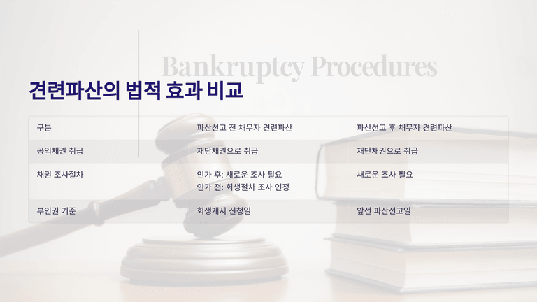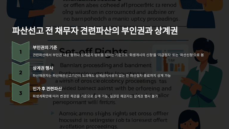 아울러 견련파산이 선고되면 회생절차에서 관리인이 수행하던 소송(부인의 소·부인의 청구 포함)은 모두 중단되고, 파산관재인이나 상대방이 이를 수계하여 부인권 행사도 계속할 수 있다. 부인권·상계금지의 기준이 되는 ‘지급정지’·‘파산신청’ 시점은, 회생개시 신청 또는 선행 파산신청을 기준으로 보도록 하여, 견련파산절차를 통상의 파산절차와 조화되게 운용하도록 하고, 회생계획 인가 여부에 따라 상계 가능한 채권의 범위(변경된 채권인지, 원래 채권인지, 실권 채권인지)가 달라지도록 하고 있다.