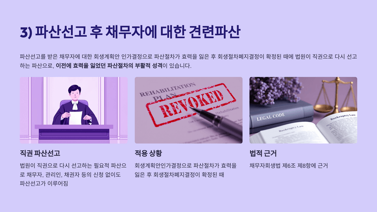 먼저 파산선고 전 채무자에 대한 견련파산은 ① 회생계획 인가 후 폐지 시 법원이 직권으로 반드시 파산을 선고하는 경우(필요적, 제6조 제1항)와, ② 회생계획 인가 전에 기각·폐지·불인가가 확정된 경우 법원이 채무자·관리인의 신청 또는 직권으로 파산을 선고할 수 있는 경우(임의적, 제6조 제2항)로 나뉜다. 이때 회생절차의 공익채권은 원칙적으로 파산절차상의 재단채권으로 전환되며, 회생계획 인가 후 폐지인 경우에는 회생계획에 따라 변경된 권리 기준으로 새로 채권을 조사·확정하고, 미신고 회생채권은 실권되어 파산에서 다시 신고해도 인정되지 않는다. 반대로 인가 이전 폐지인 경우에는 회생절차에서의 신고·조사·확정을 파산절차의 것으로 보아 미신고채권도 파산절차에서 신고할 수 있고, 채권자는 원래 채권액을 기준으로 파산절차 종료 시까지 상계를 할 수 있다.