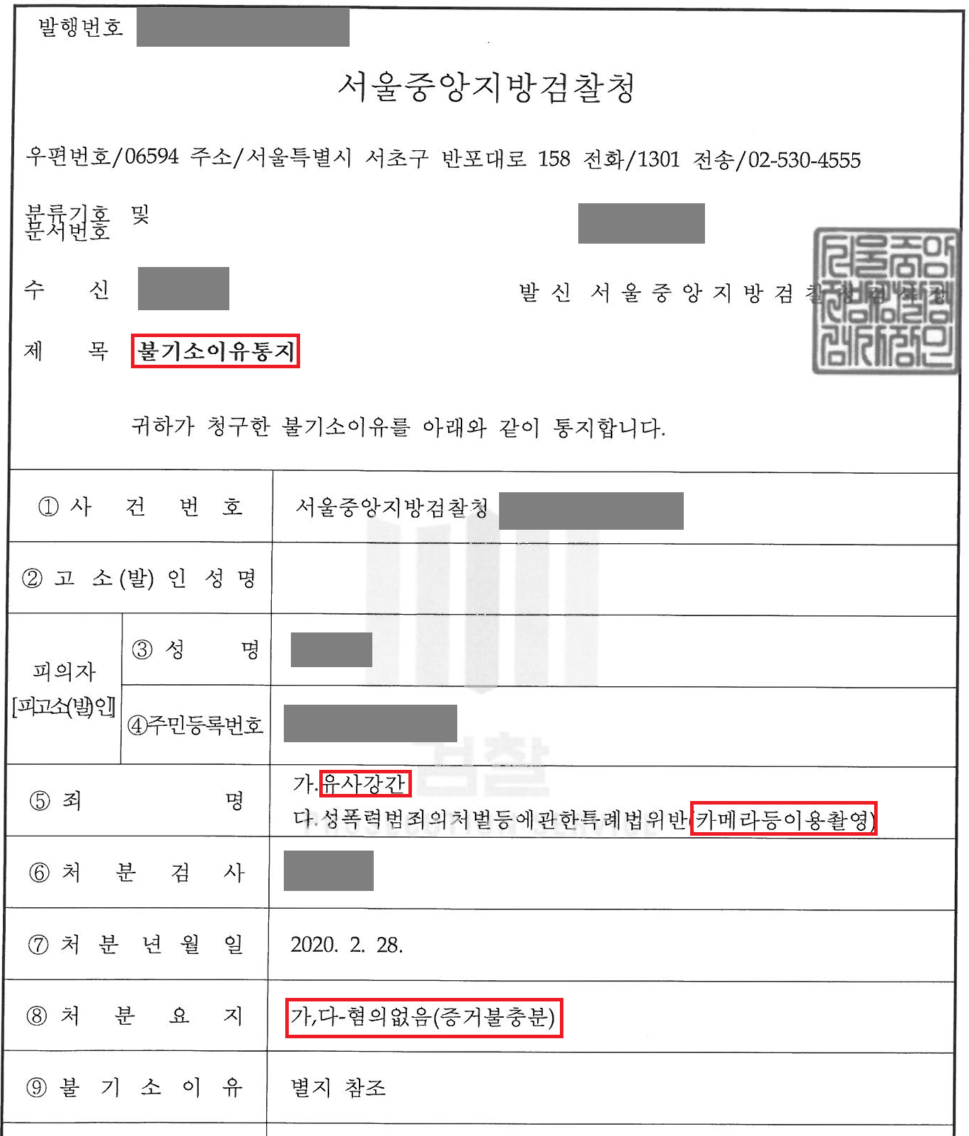 검찰은 저의 변론을 받아들여 의뢰인에 대한 유사강간, 성폭력범죄의 처벌 등에 관한 특례법 위반(카메라등이용촬영) 혐의에 대해 모두 불기소처분을 하였습니다. 의뢰인에 대한 폭행 혐의는 인정되었으나 이는 의뢰인과 고소인이 다투는 과정에서 쌍방폭행을 행사한 것으로 처리되어 의뢰인은 어떠한 법적 처벌도 받지 않고 억울한 성범죄 누명을 벗을 수 있었습니다.
