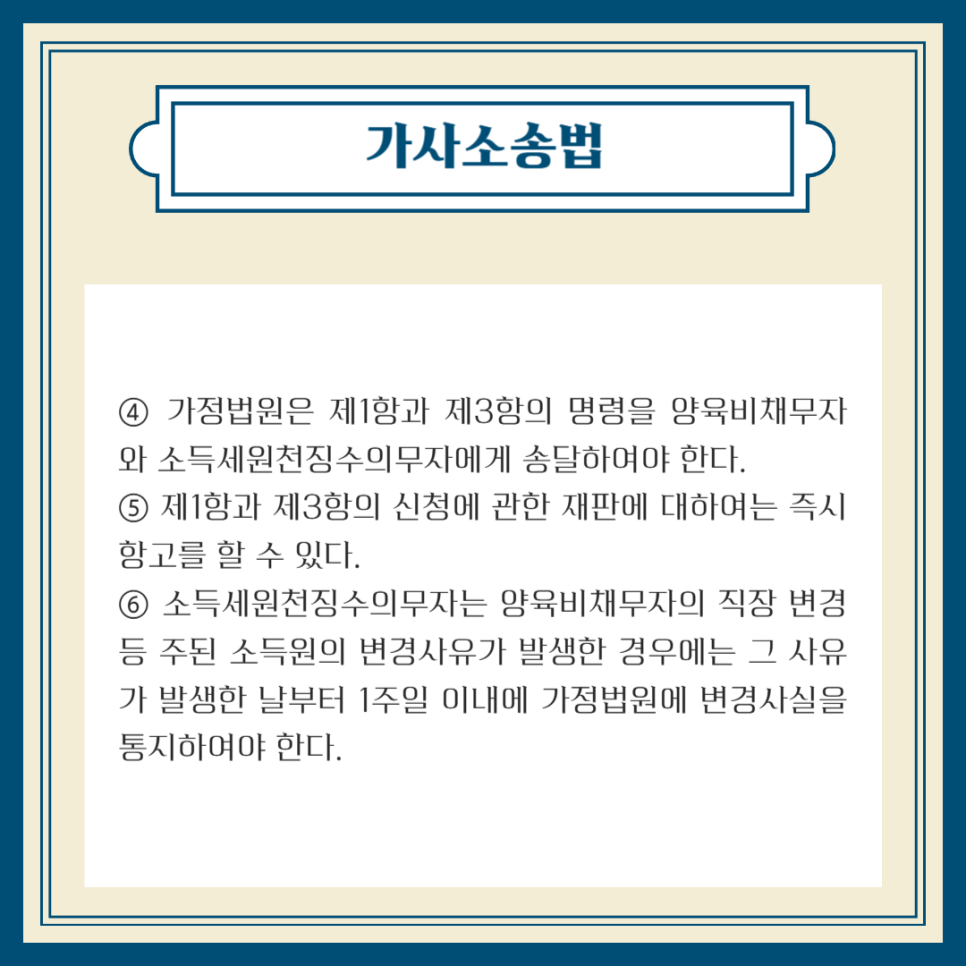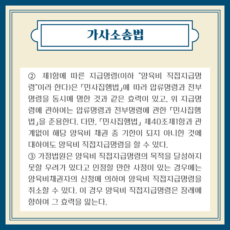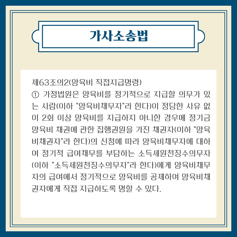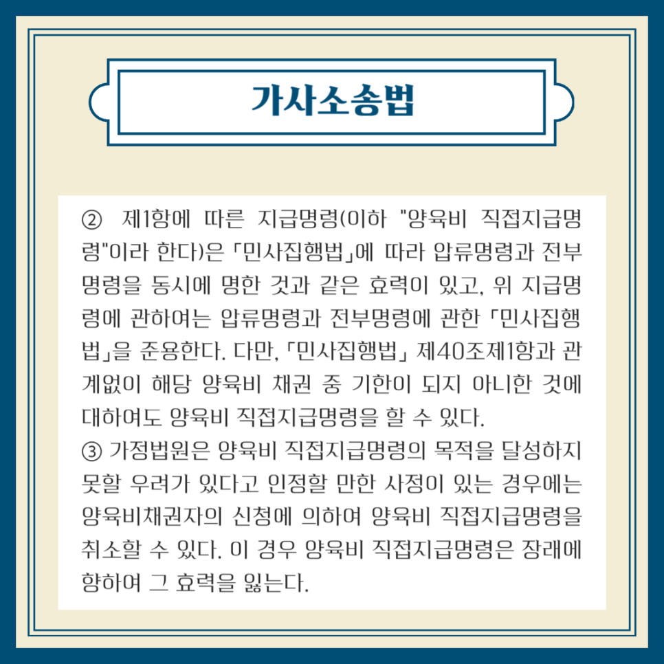 양육권자는 법원에 양육비 직접 지급명령을 신청할 수 있습니다(가사소송법 제63조의2).