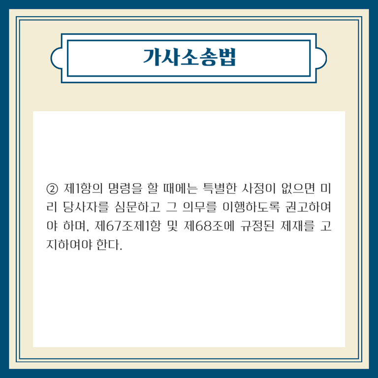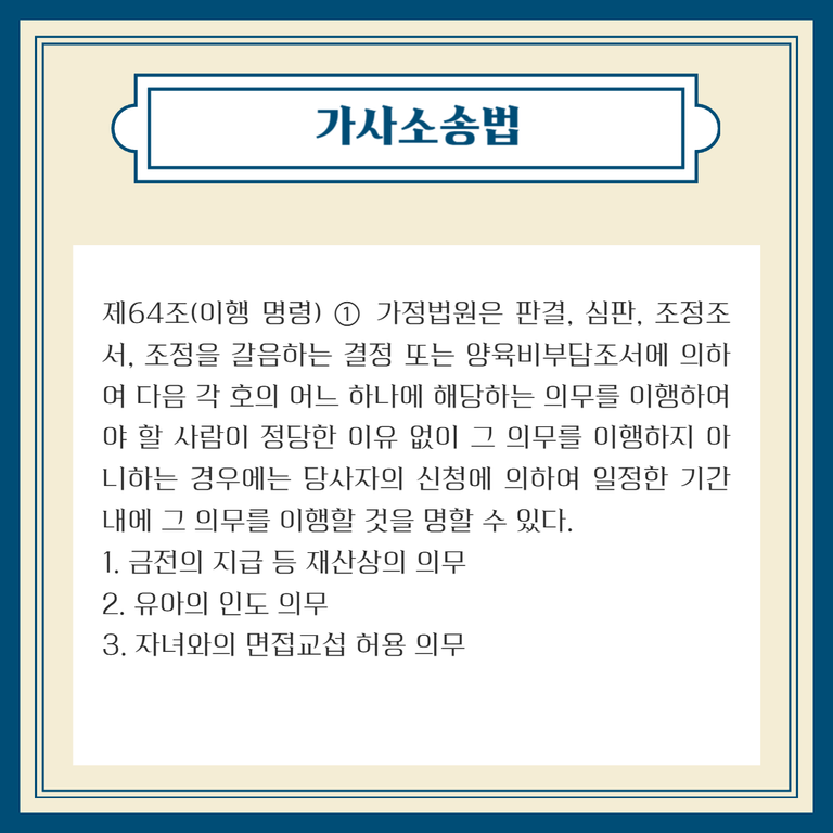"양육비를 지급하라"고 명령하는 것입니다(가사소송법 제64조). 비양육권자가 정당한 이유 없이 이행명령을 위반하면 1천만원 이하의 과태료를 부과할 수 있고, 정당한 이유 없이 3기 이상 의무를 이행하지 않으면 법원은 30일 범위에서 의무를 이행할 때까지 감치를 명할 수 있습니다(가사소송법 제68조).