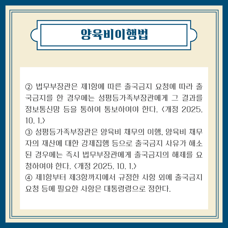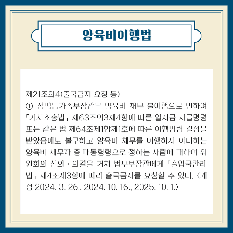 다만 모든 경우에 출국금지가 되는 것은 아니고, 양육비이행법 시행령 제17조의3에 따라 ① 양육비 채무가 3천만원 이상인 사람, ② 양육비 채무가 3기 이상 이행하지 않는 사람에 대해서 가능합니다.