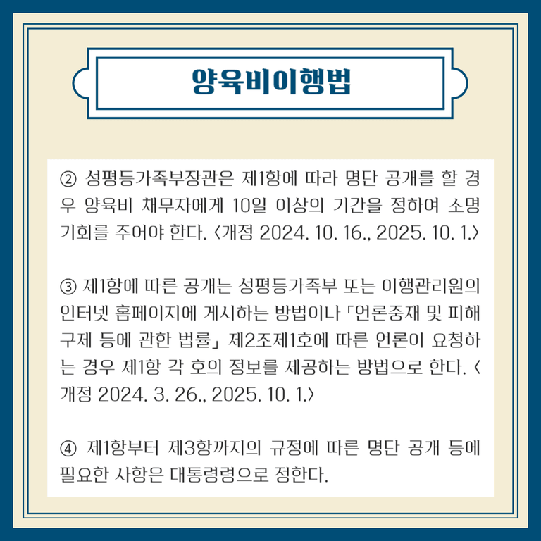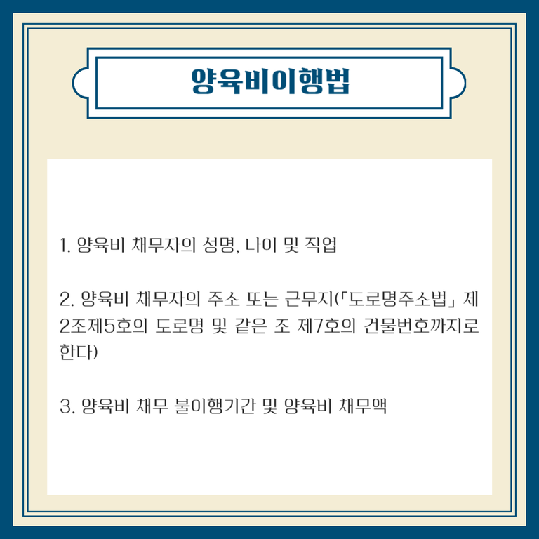 단에는 양육비 채무자의 성명, 나이, 직업, 주소, 근무지, 불이행 기간 및 채무액이 공개됩니다. 이 명단은 여성가족부 홈페이지에서 확인할 수 있습니다.