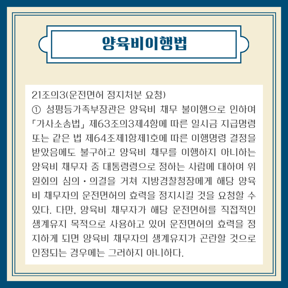 다만 운전면허가 직접적인 생계유지 목적으로 사용되고 있어 운전면허 정지 시 생계유지가 곤란한 경우는 제외됩니다. 운전면허 정지처분은 양육비이행관리원을 통해 신청할 수 있습니다.