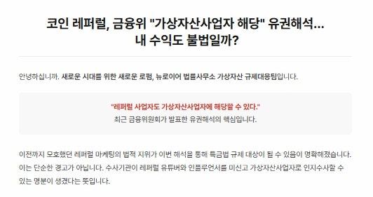 저희 홈페이지 코인 레퍼럴 가상자산사업자 법률칼럼 내용 중 일부