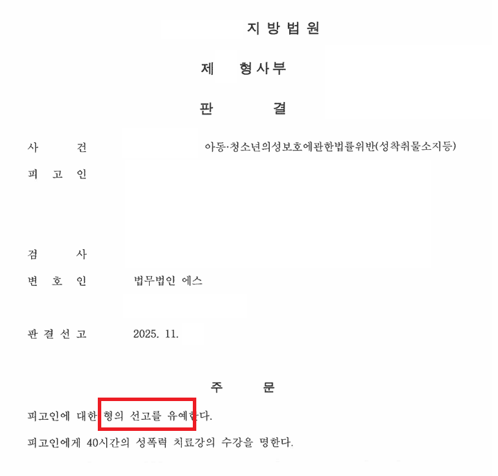 5. A씨는 성착취물소지등 사건에서 저희의 조력을 받음으로써 1심 공판단계에서 선고유예 선고를 받으셨습니다.