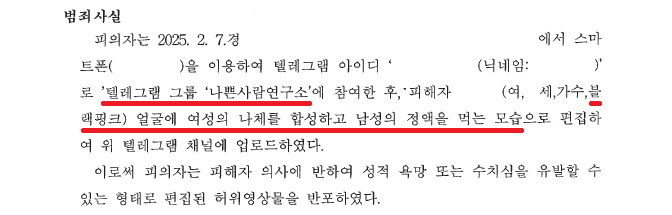 A씨는 2025. 2. 7.경 연예인 합사방 텔레그램 그룹 '나쁜사람연구소'에 참여하여 가수 블랙핑크 멤버 ○○의 얼굴에 여성이 나체로 남성의 정액을 먹는 사진의 딥페이크를 제작하여 업로드하였습니다.