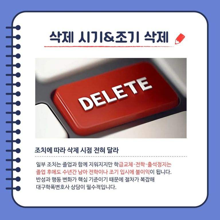 일부 경미한 조치는 졸업 즉시 삭제되지만 출석정지·전학·학급교체는 졸업 후 수년 동안 학생부에 유지됩니다.