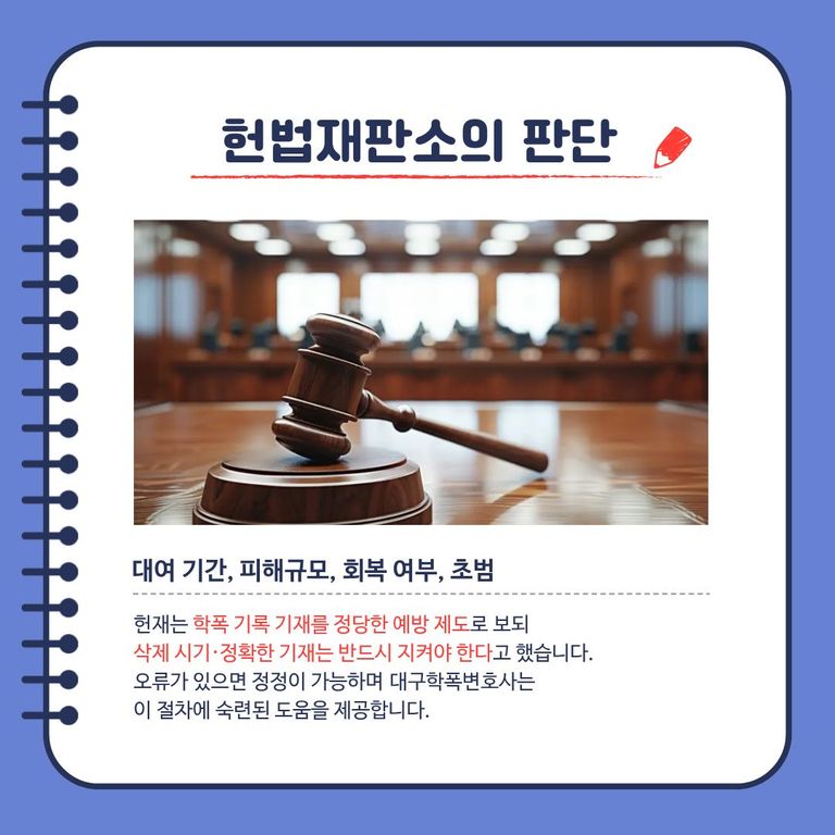 헌법재판소는 학교폭력 기록 기재가 학생의 권리를 제한하더라도 학교폭력 예방 목적이 정당하다고 판단했습니다.