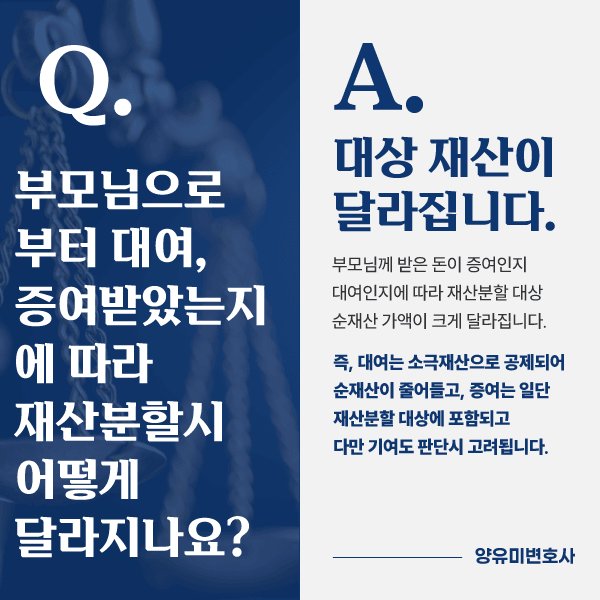 Q. 부모님으로부터 대여, 증여받았는지에 따라 재산분할시 어떻게 달라지나요?