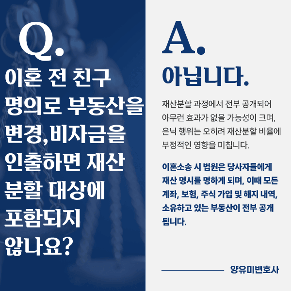 Q. 이혼 전에 친구 명의로 부동산을 변경하거나,비자금을 인출해 놓으면 재산분할 대상에 포함되지 않나요?