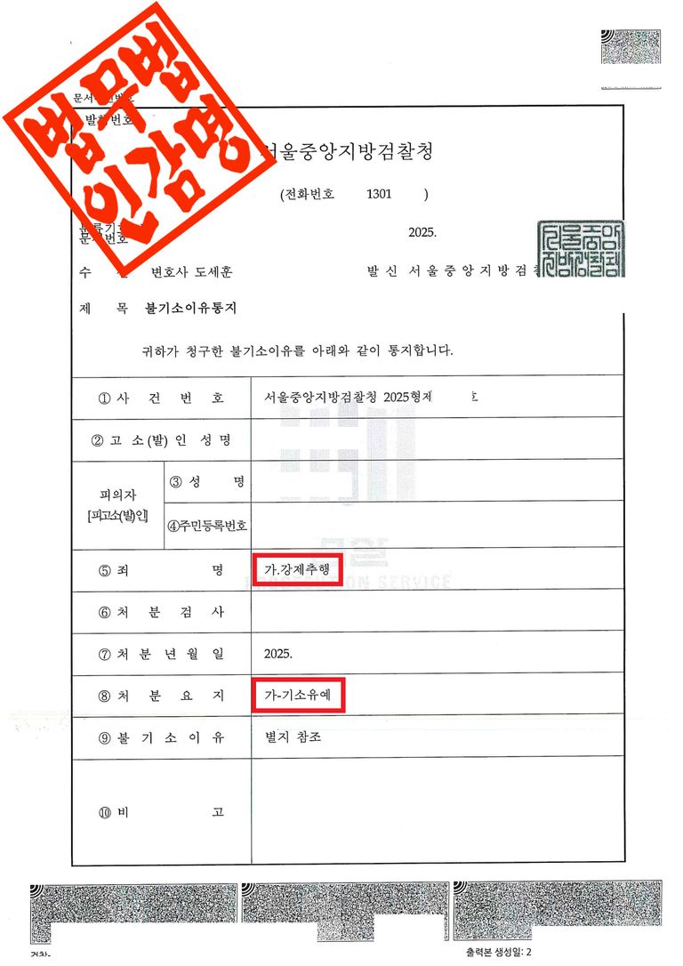 서울중앙지방검찰청은 이 사건에 대해 다음과 같은 사유로 불기소 결정을 하였습니다.
