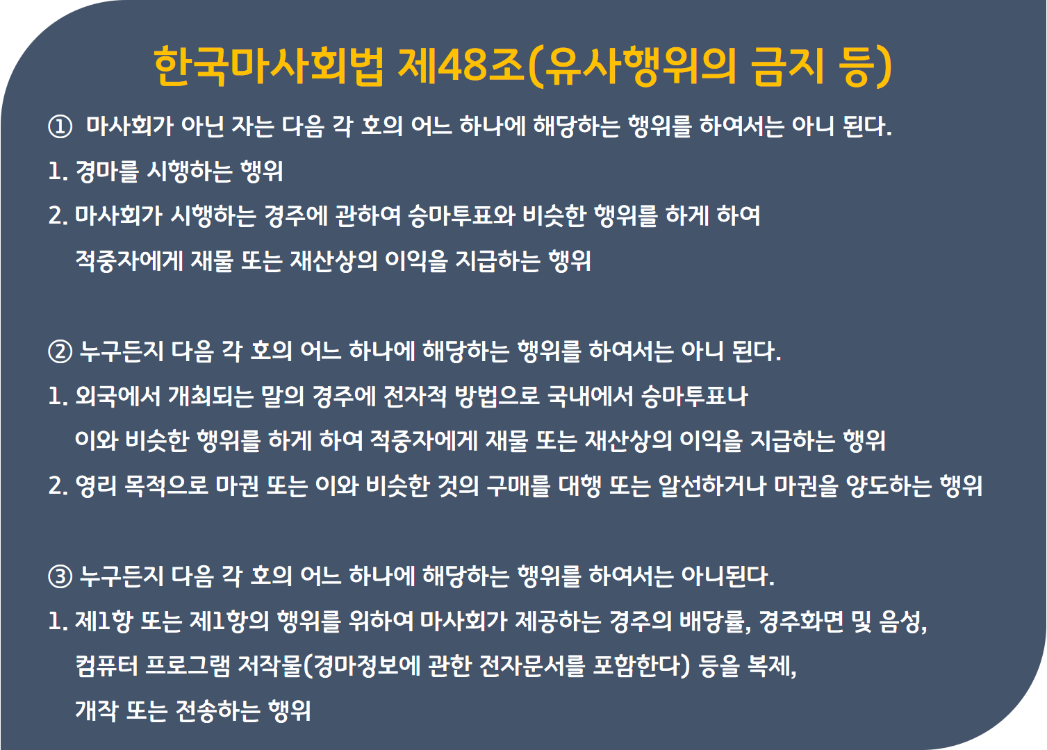 마사회법은 한국마사회를 설립하여 경마의 공정한 시행과 말 산업 육성에 관한 사업을 효율적으로 수행하게 함으로써 축산의 발전에 이바지하고 국민의 복지 증진과 여가선용을 도모함을 목적으로 합니다. 한국마사회법 위반이란 마사회가 시행하는 경주를 이용하여 도박을 하거나 이를 방조하는 경우, 하단의 한국마사회법 제48조제1항, 제2항 또는 같은 조 제3항 1호를 위반하는 경우 7년 이하의 징역 또는 7,000만 원 이하의 벌금에 처하게 됩니다.