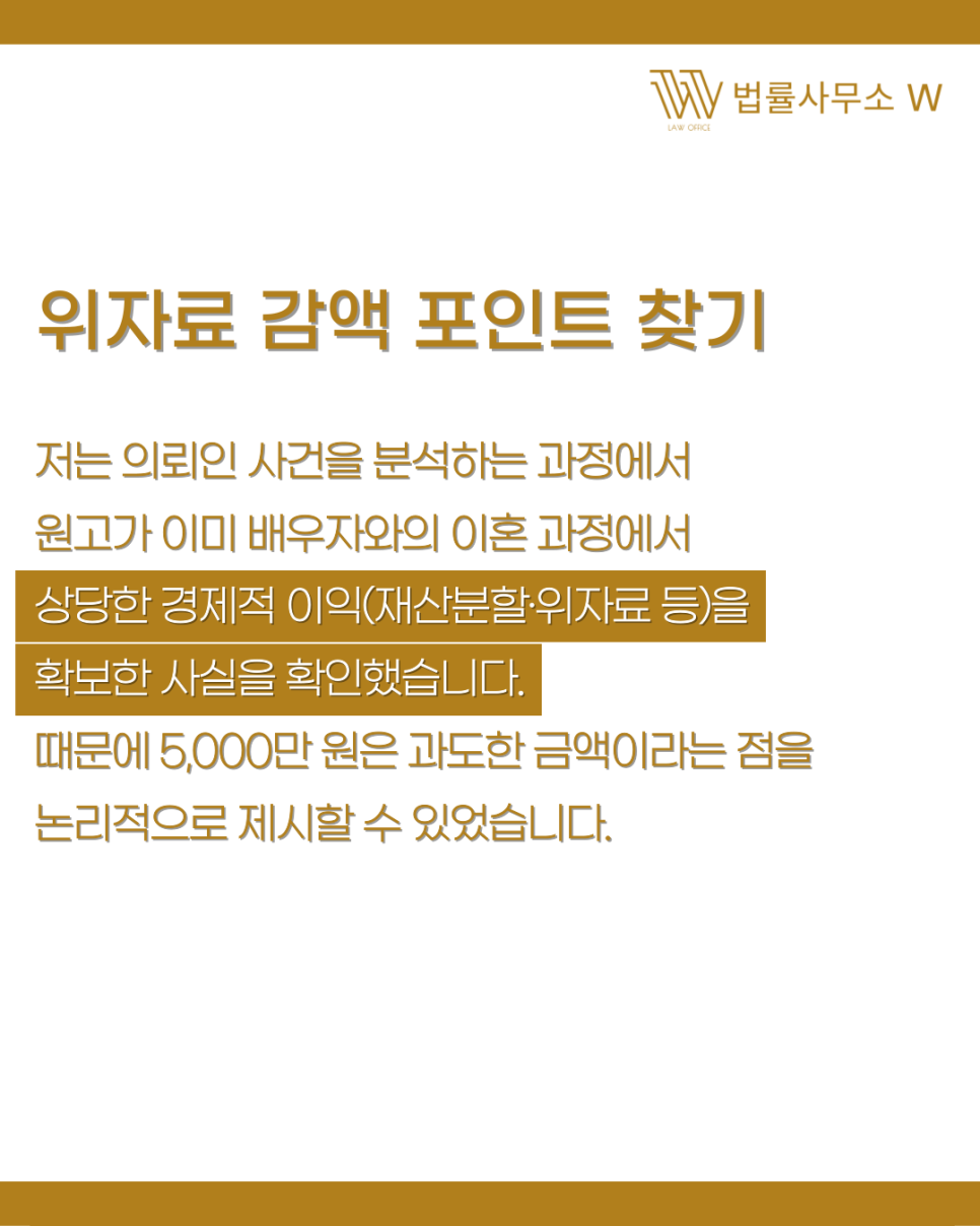 저는 의뢰인 사건을 분석하는 과정에서 원고가 이미 배우자와의 이혼 과정에서 상당한 경제적 이익(재산분할·위자료 등)을 확보한 사실을 확인했습니다.