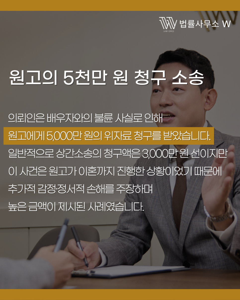 일반적으로 상간소송의 청구액은 3,000만 원 선이 자주 등장합니다. 하지만 이 사건은 원고가 이혼까지 진행한 상황이었기 때문에 추가적 감정·정서적 손해를 주장하며 높은 금액이 제시된 사례였습니다.