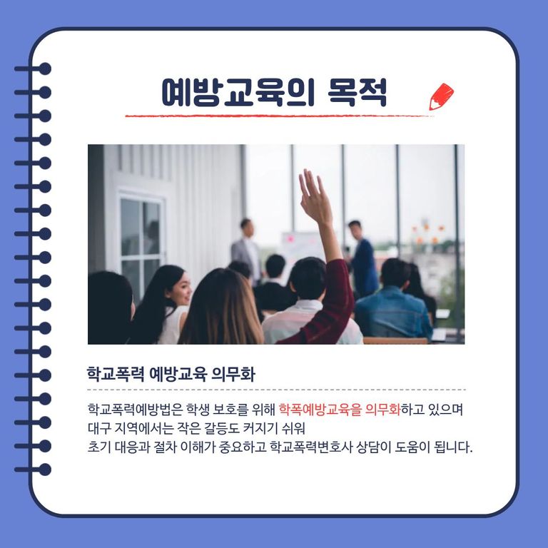 학교폭력예방법은 학생을 보호하고 분쟁을 조기에 막기 위해 대구학폭예방교육을 의무화하고 있습니다.