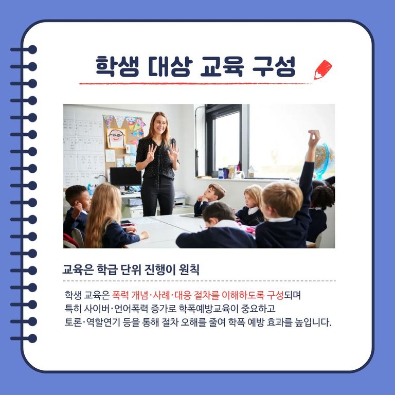 학생 교육은 학급 단위 진행이 원칙이며 폭력의 개념, 실제 사례, 대응 절차를 쉽게 이해하도록 구성됩니다.