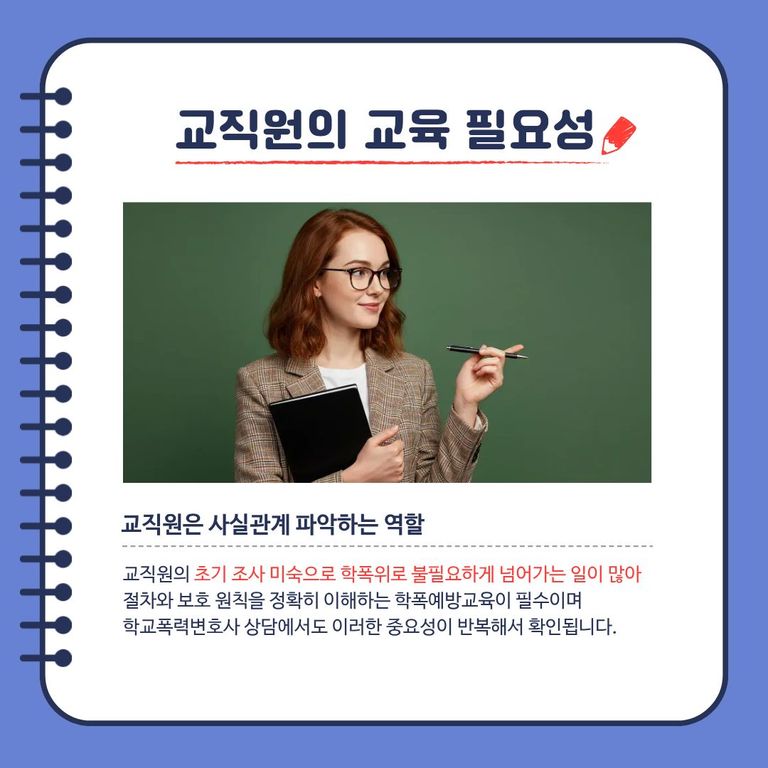 교직원은 학교폭력 사안의 첫 단계에서 사실관계를 파악하는 역할을 맡고 있어 법적 구조를 정확히 알아야 합니다.
