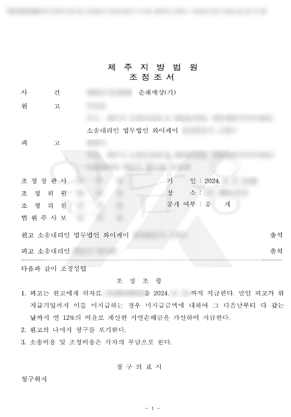 법무법인 YK의 조력으로, 통상적으로 소송을 통하여도 인정되기 어려운 액수의 금액으로 조정이 성립하였습니다.
