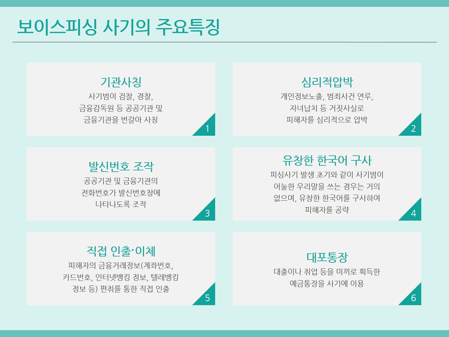 보이스피싱은 상단의 표와 같은 주요 특징을 지니며, 전체 공범자들의 범행을 지휘하는 총책, 전화상담 등을 통하여 피해자를 기망하는 콜센터 가담자, 대포통장/카드를 모으는 모집책 또는 전달책, 편취한 금원을 인출하여 전달하는 업무를 담당하는 인출책 등의 업무들간 상호작용으로 완성되는 신종 보이스피싱 범행이 성행하기 시작하면서, 피해 금액이 더욱 커지고 범행 형태도 매우 다양해지고 있습니다.