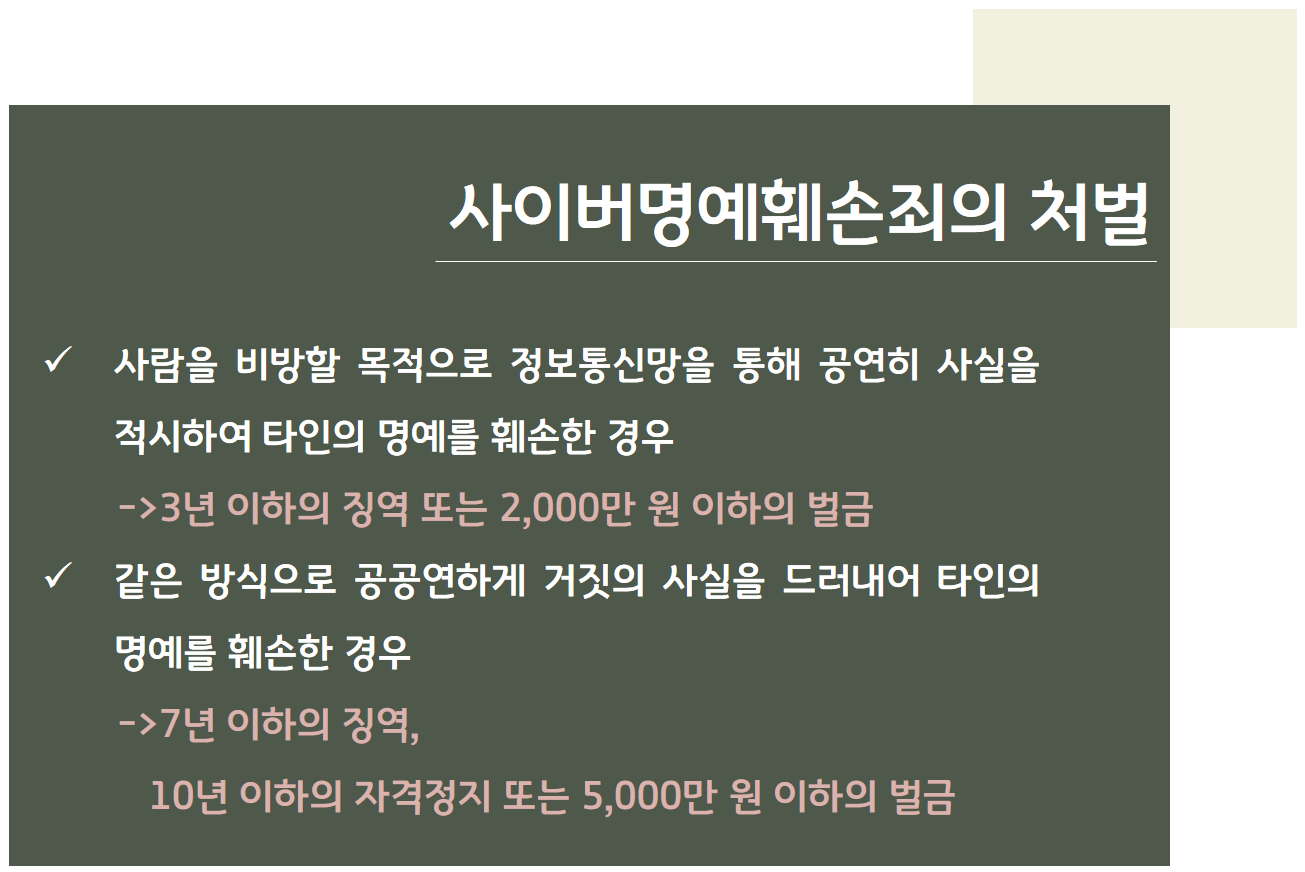 사이버명예훼손죄에 대한 처벌은 상단과 같이 사람을 비방할 목적으로 정보통신망을 통해 공연히 사실을 적시하여 타인의 명예를 훼손한 경우에는 3년 이하의 징역 또는 2,000만 원 이하의 벌금에 처해지며, 같은 방식으로 공공연하게 거짓의 사실을 드러내어 타인의 명예를 훼손한 경우에는 7년 이하의 징역, 10년 이하의 자격정지 또는 5,000만 원 이하의 벌금에 처해지게 됩니다.