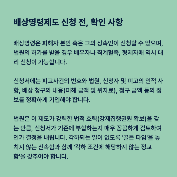 배상명령제도를 활용하기 위해서는 무엇보다 '골든 타임'을 놓치지 않는 것이 중요합니다.