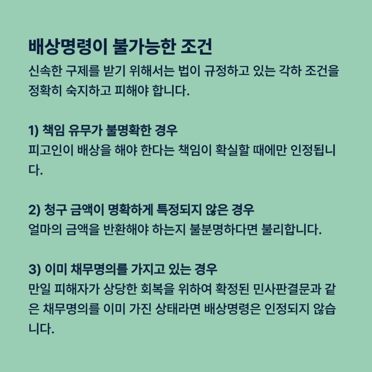 만일 피해자가 상당한 회복을 위하여 확정된 민사판결문과 같은 채무명의를 이미 가진 상태라면 배상명령은 인정되지 않습니다. 또한, 이미 민사소송 등 다른 절차를 통해 손해배상 청구를 피고에게 한 상태여도 배상신청은 불가능합니다.