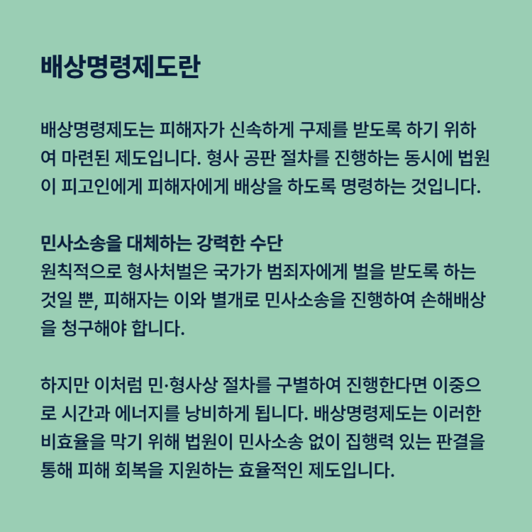 하지만 이처럼 민·형사상 절차를 구별하여 진행한다면 이중으로 시간과 에너지를 낭비하게 됩니다. 배상명령제도는 이러한 비효율을 막기 위해 법원이 민사소송 없이 집행력 있는 판결을 통해 피해 회복을 지원하는 효율적인 제도입니다.